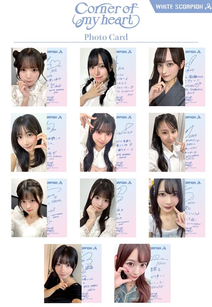 2025年10月22日(水)発売WHITE SCORPIONの2ndミニアルバム「Corner of my heart」<通常盤>を対象店舗でお買い求めいただくと特典の「オリジナルトレカ」(全11種)をプレゼント! 配布対象店舗は<こちら> お近くのCD取り扱い店やECショップで是非お買い求めください!※特典はなくなり次第終了となります。ご予約、ご購入時に店舗へお問い合わせください。 ※各種リリースイベントでのご予約分へは「オリジナルトレカ」の付与はいたしかねます。ご了承ください。 2025年10月22日(水)発売 WHITE SCORPION 2ndミニアルバム「Corner of my heart」 品番:KICS-4233 定価:¥2,500(税抜価格:¥2,273) 形態:CD <収録内容> 01.Corner of my heart 02.純愛トースター 03.I do love you! 04.Beach opening 05.愁情 06.なんて僕は無力なんだろう 07.希望には羽がついてる <封入特典> 生写真1種ランダム封入(全11種)※初回プレス分のみ <メーカー特典> オリジナルトレカ(全11種よりランダム1種お渡し) 配布対象店舗は<こちら>